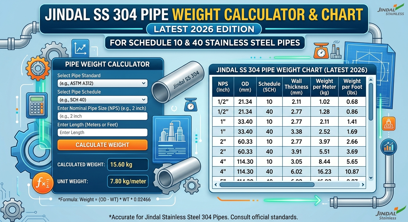 Jindal SS 304 Pipe Weight Calculator & Chart (Latest 2026)